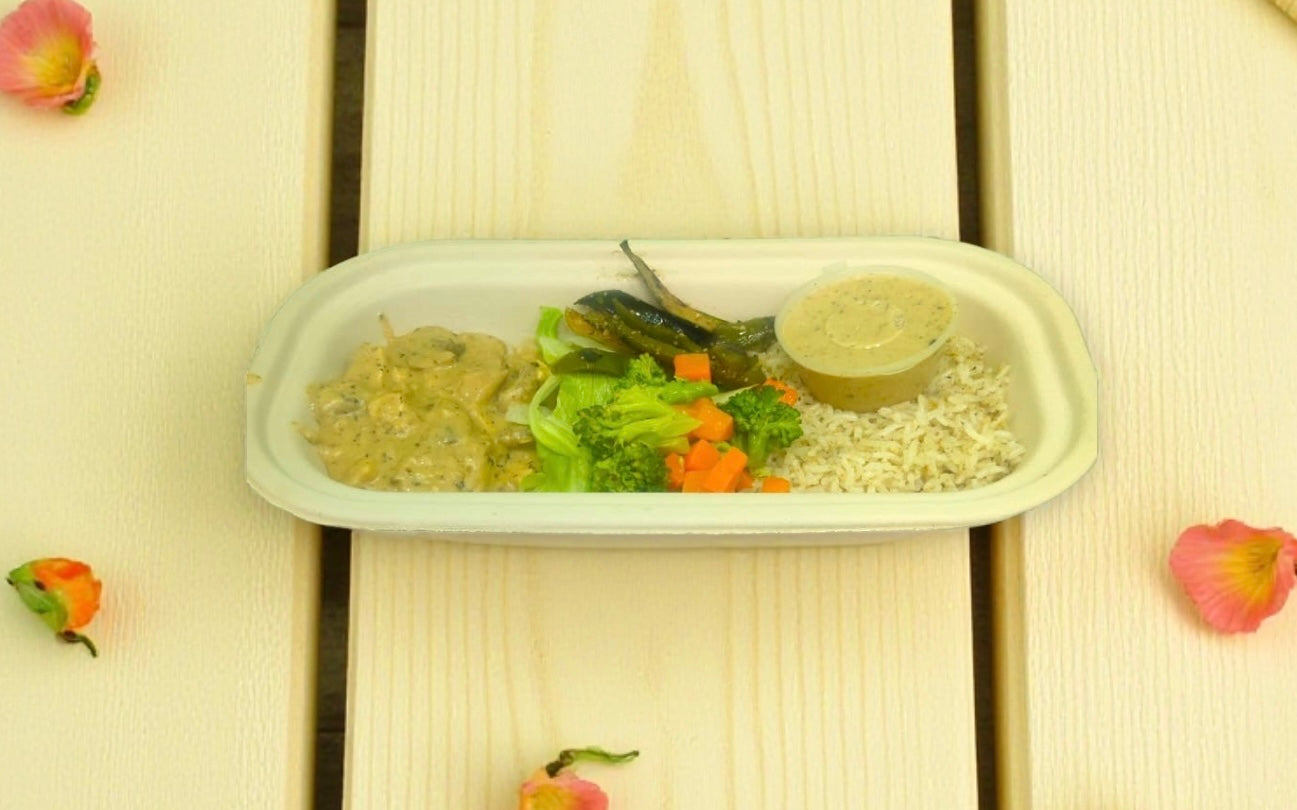Herb Rice,Cheesy Chicken,Green Peas, Babycorn, Sautéed Veggies, Lettuce, Cheesy Gravy